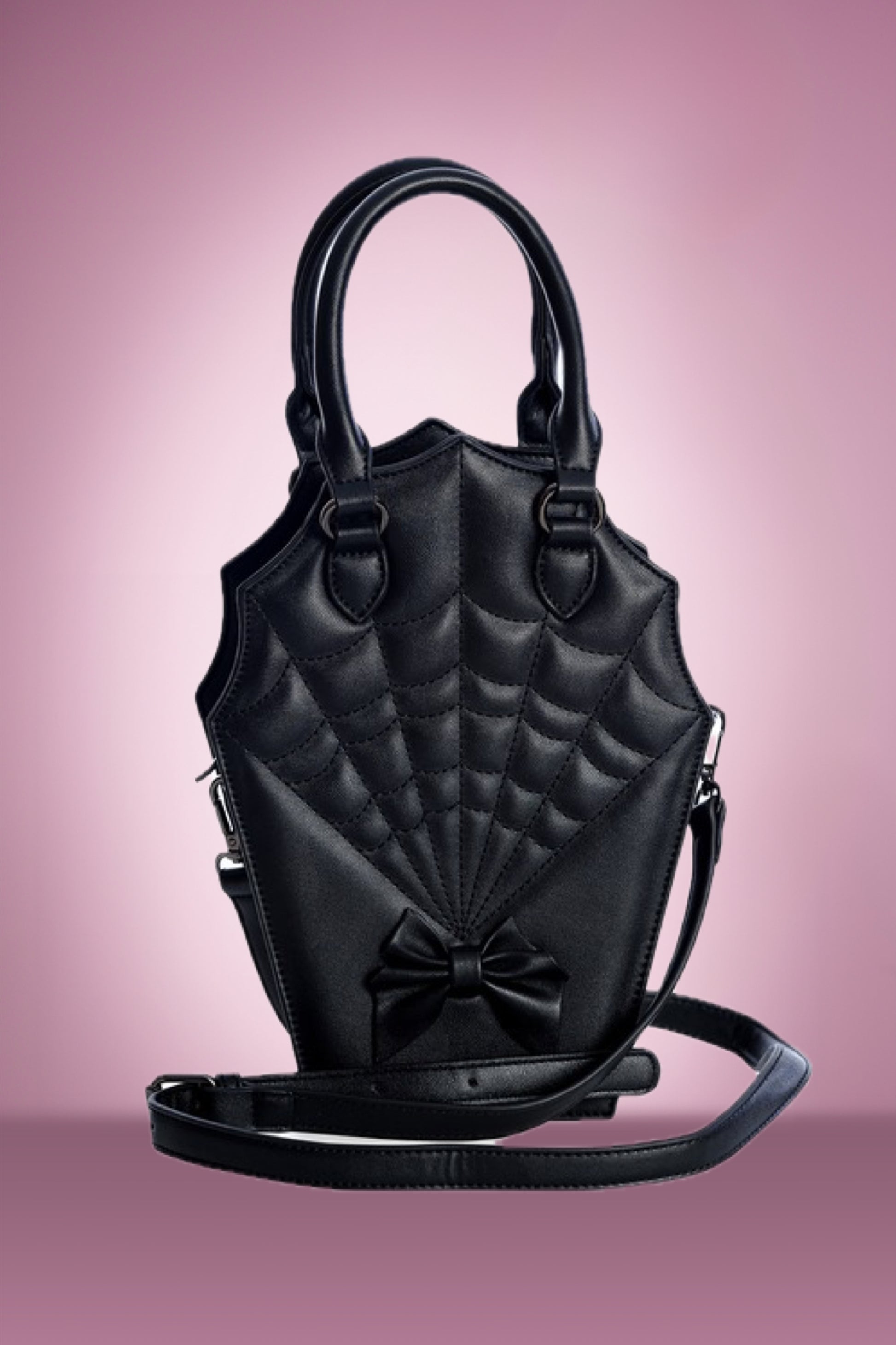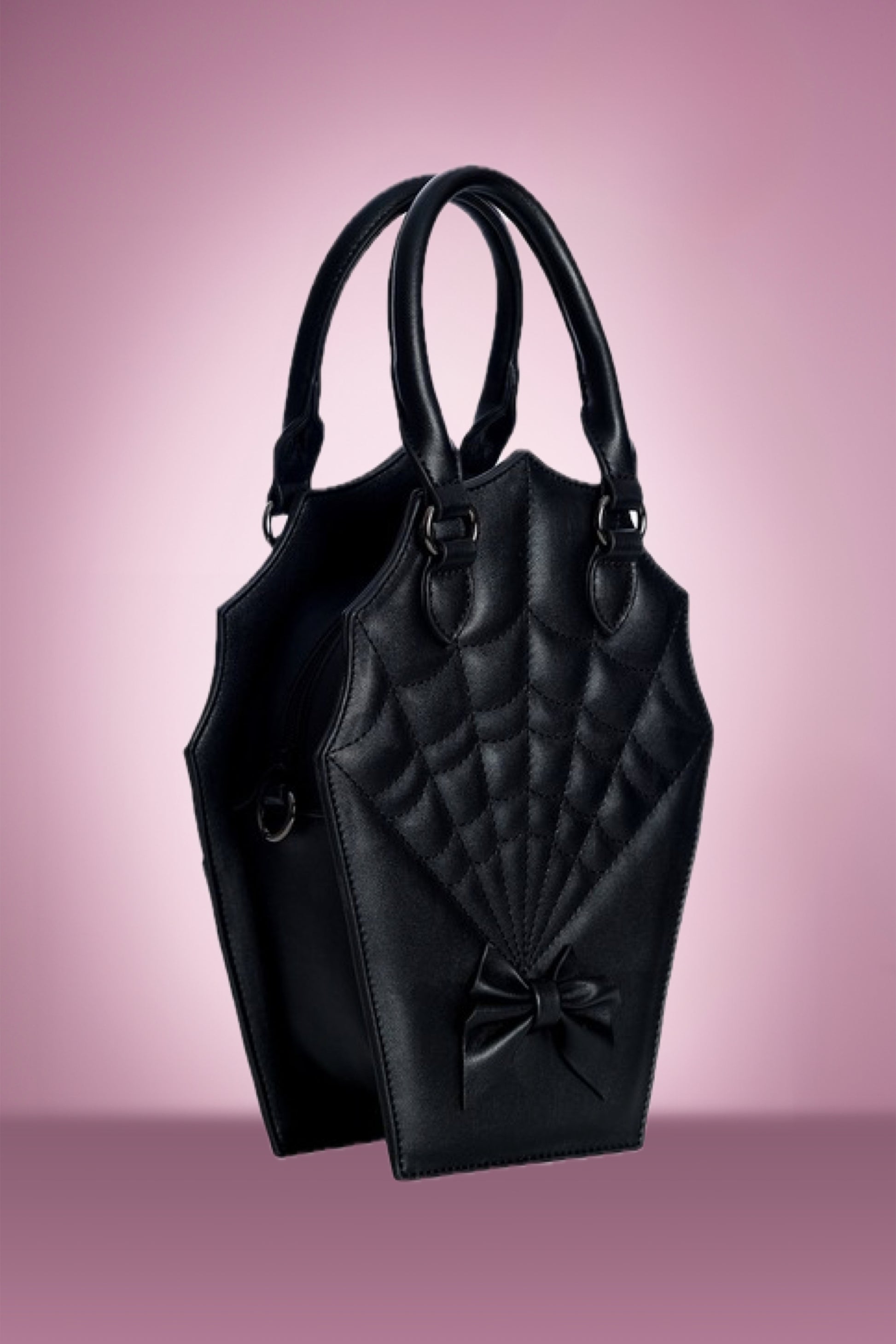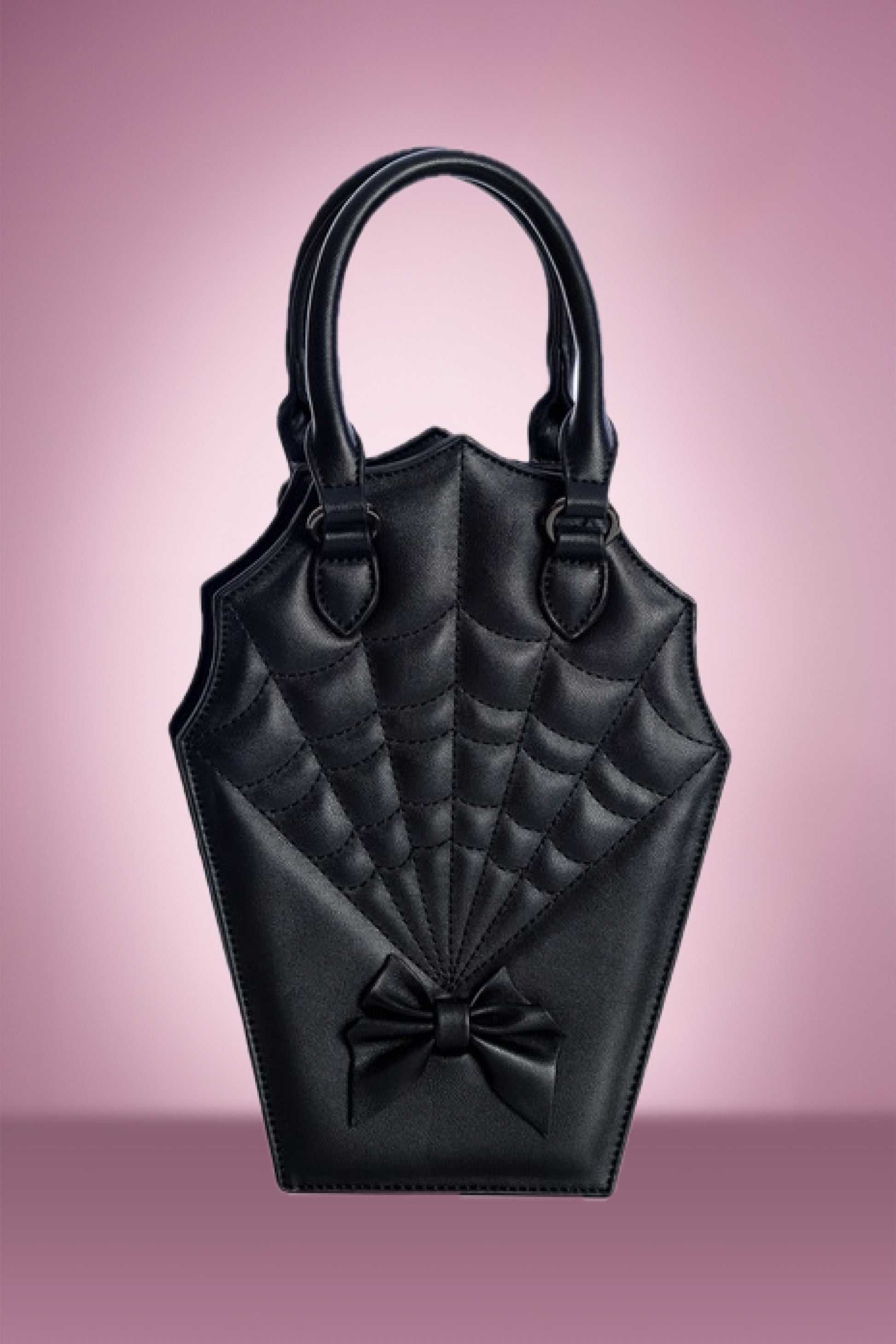 Unlock your villain era with this fire red quilted coffin bag serving shimmer lacquer realness. The embroidered spider web and batwing bow hit different, while the detachable strap gives you styling options. Inside pockets keep your essentials sorted while you're living your best dark life.