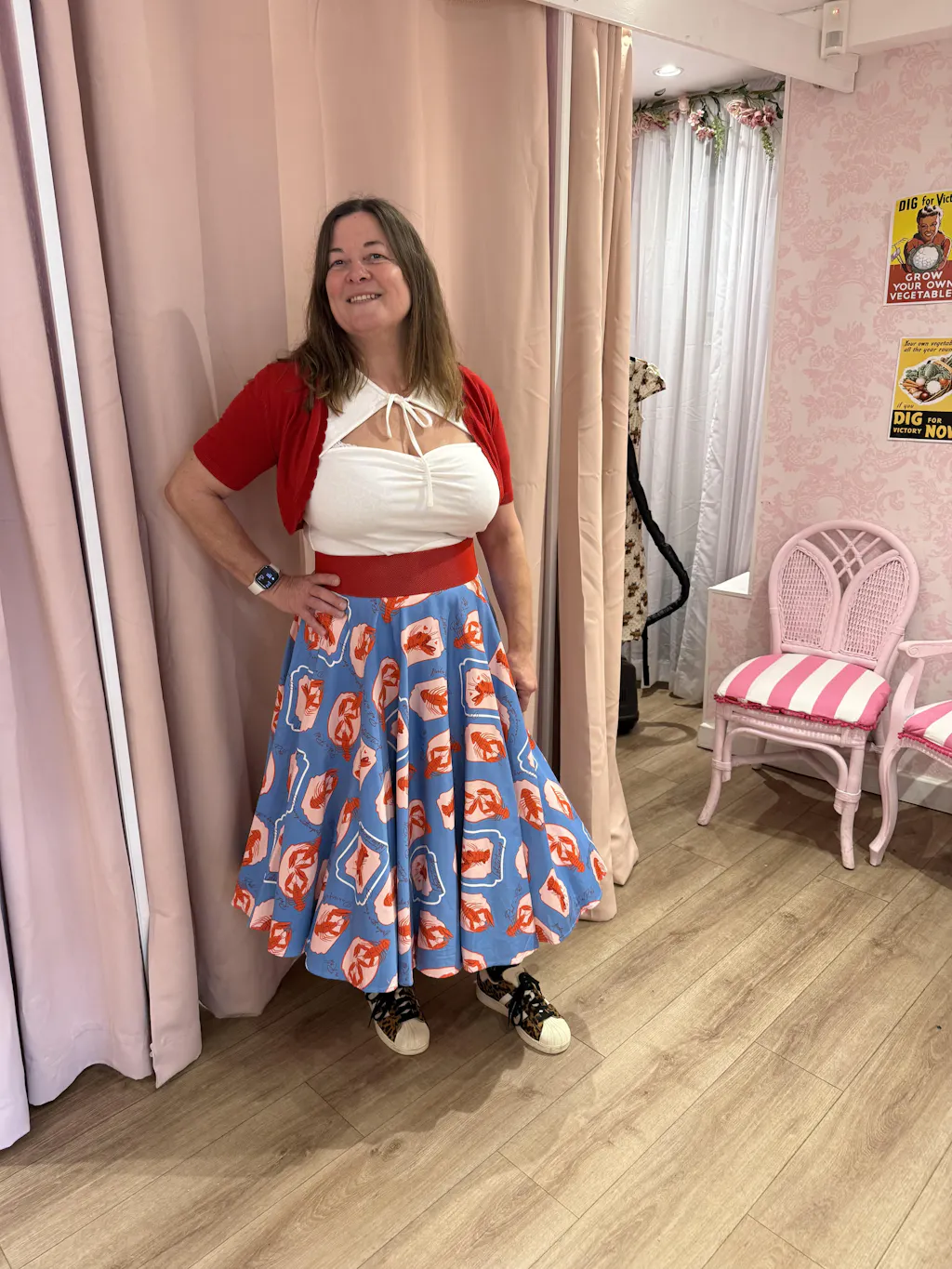 Dive into a sea of style with the Blue Libby Lobster Love Skirt! This 1950s-inspired full swing skirt, featuring a delightful Lobster print, is a catch you won't want to let go. Made from light cotton, its high-waisted silhouette and side seam pockets keep you looking snazzy while holding all your treasures. Add a petticoat for an extra flounce—because who doesn't love a lil' drama? Perfect for turning heads and making waves! 🦞