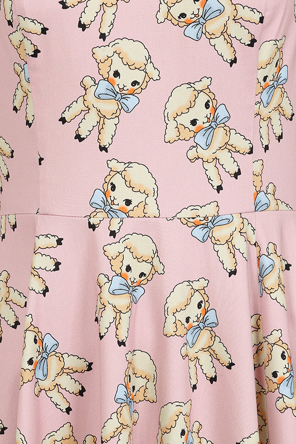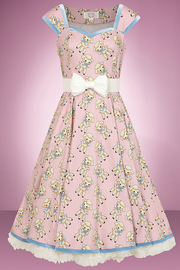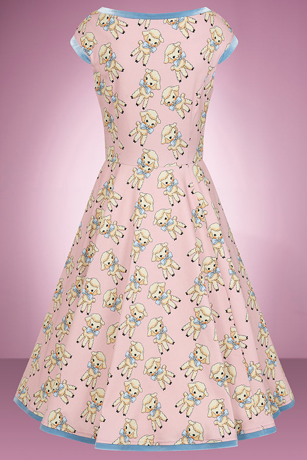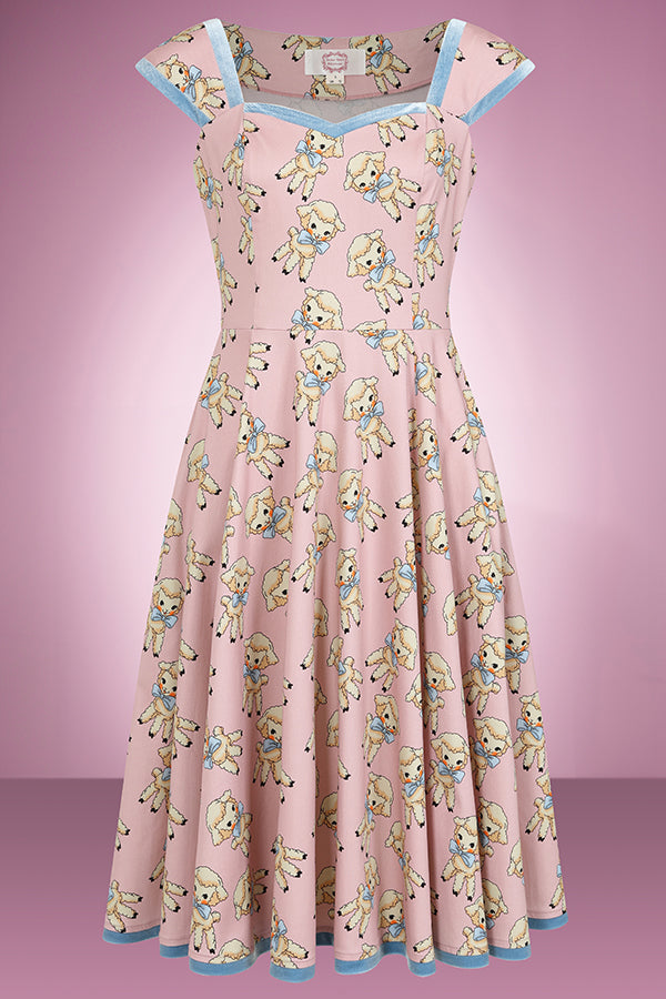 Get ready to turn heads with our Bo Peep Swing Dress from the latest SS25 collection! This playful dress features a blush pink background adorned with fluffy lambs, while a soft powder blue trim adds a touch of elegance. Plus, with a full swing skirt, pockets, and side zip, you'll look cute and feel comfortable all day long!