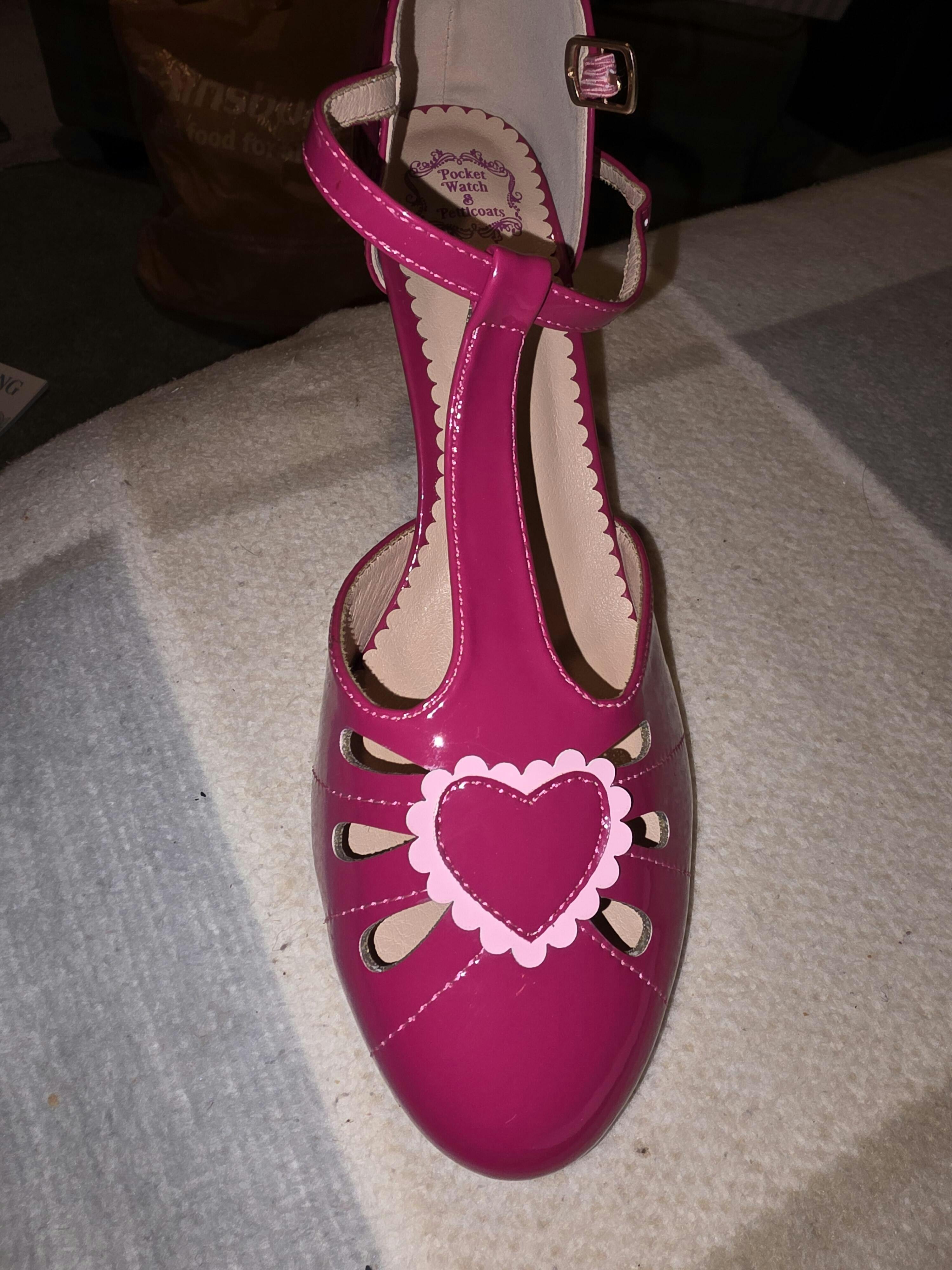 Step into classic elegance with these 1950's inspired Hot Pink Heart Shoes. Crafted with a glossy hot pink patent leather upper, heart detail to the heel as well as a perfectly yet comfortable rounded toe, they're designed to imbue you with a timeless look that pairs with everything. Minimal but chic, these shoes provide a luxurious finish to any outfit.
