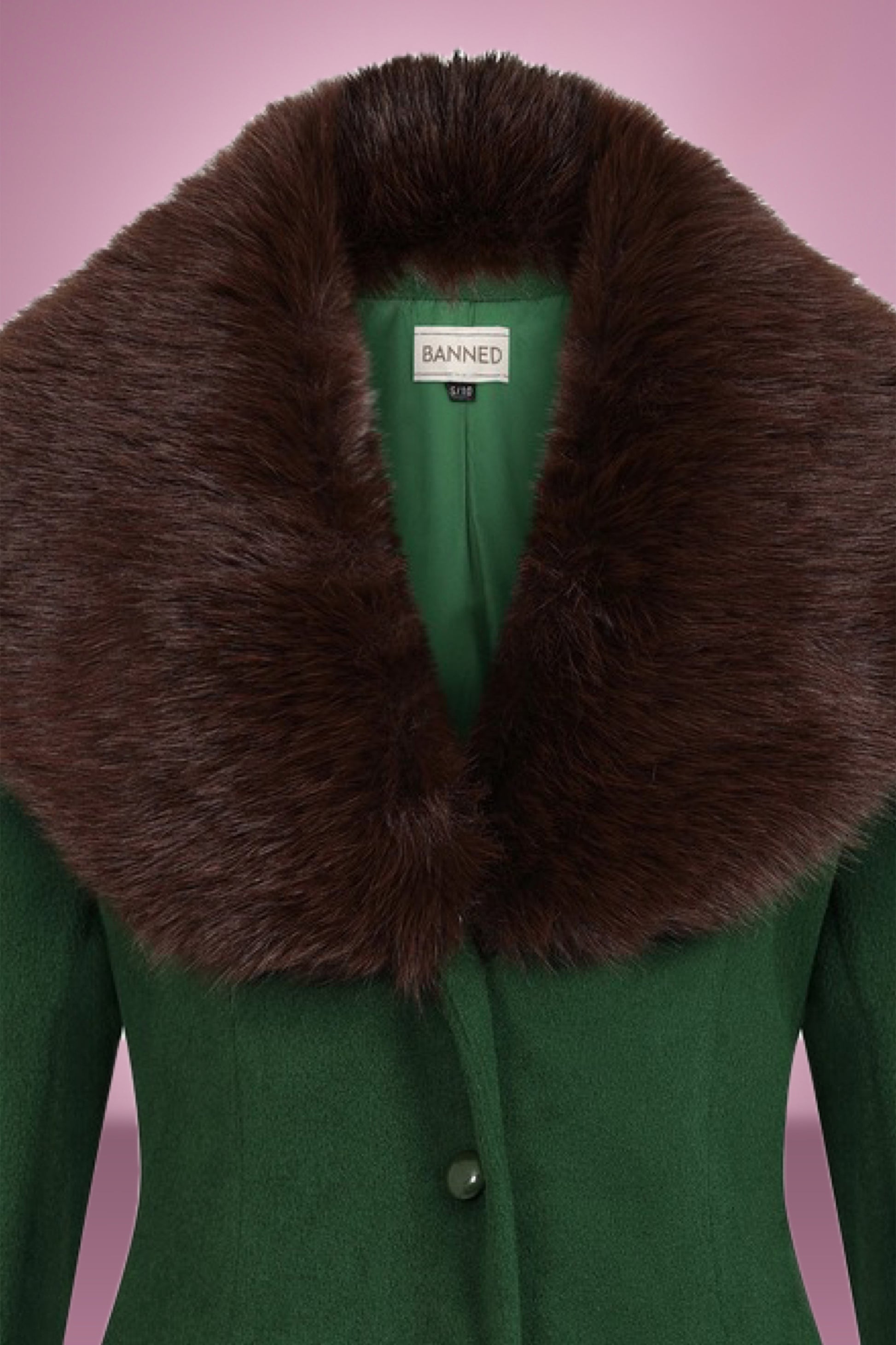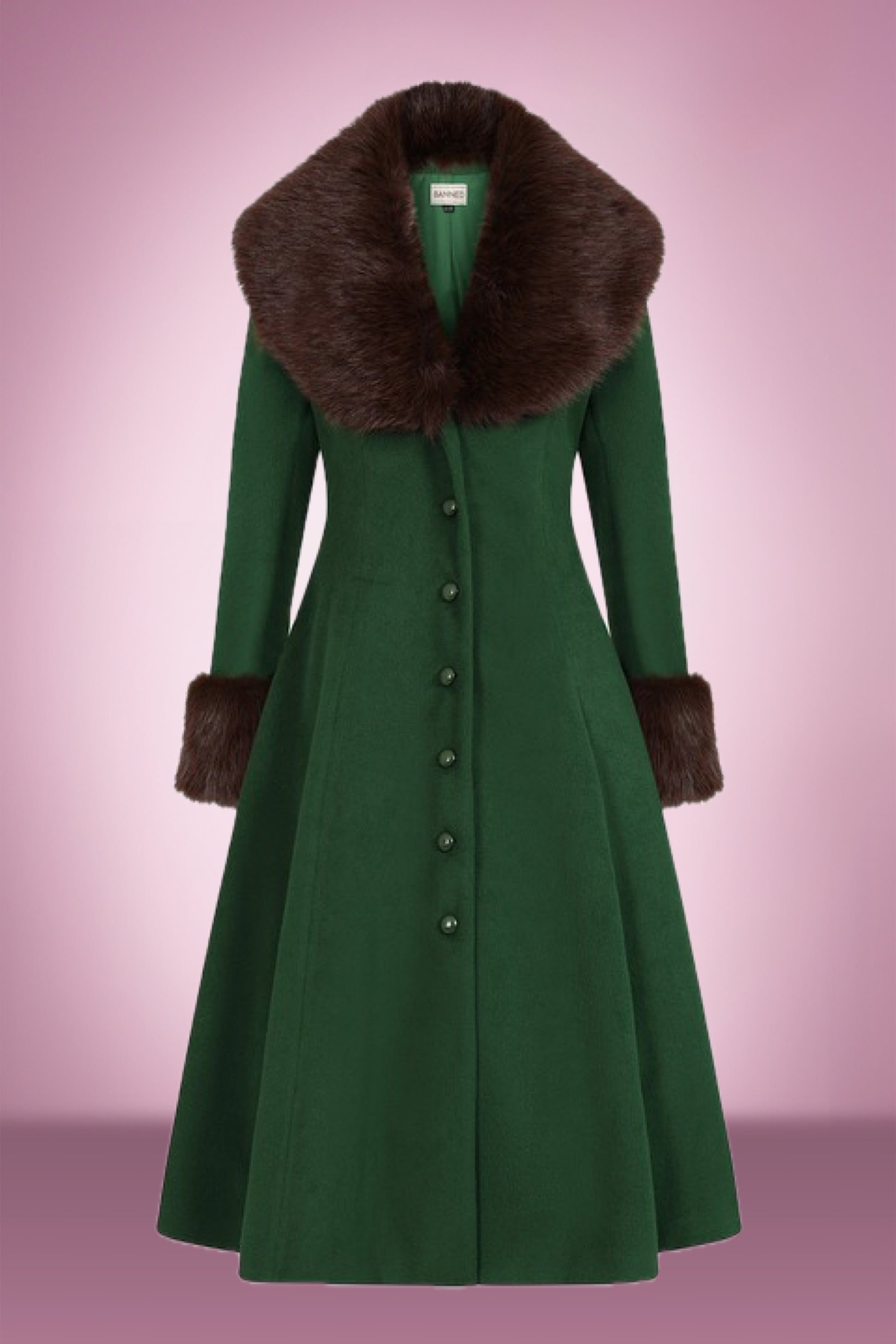 Introducing our Green Ginger Swing Coat, a masterpiece inspired by the elegance of the 50s. With its fully detachable faux fur collar and cuffs, this coat exudes luxury and sophistication. Its classic silhouette is elevated by glamorous details, making it the perfect vintage outerwear. Unlike our traditional coats, this stunning piece is longer in length and is also more spacious, so for a cinched in look - simply size down. Complete with pockets, a full swing bottom, and guaranteed to turn heads, this is a must-have for the fashion-forward.