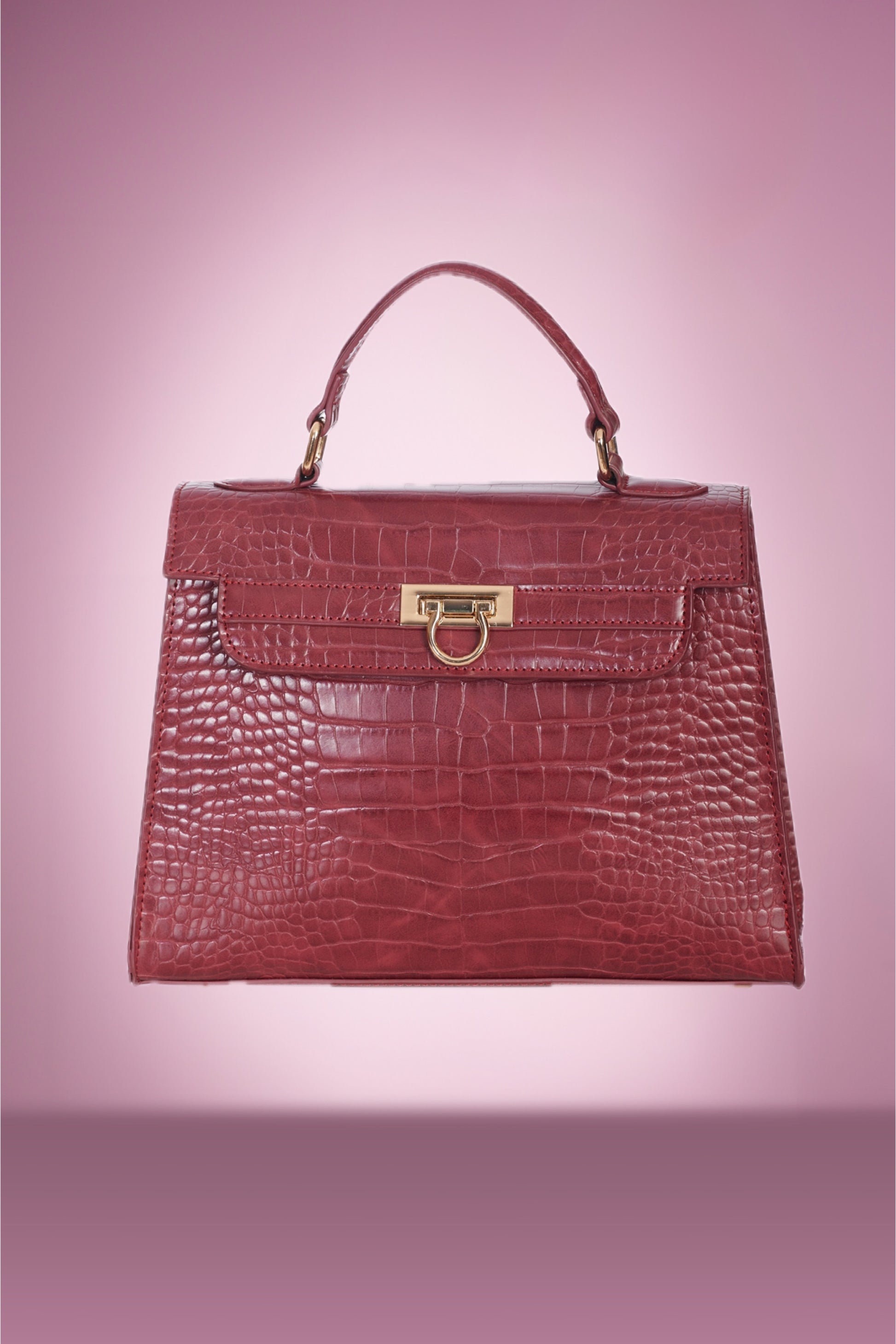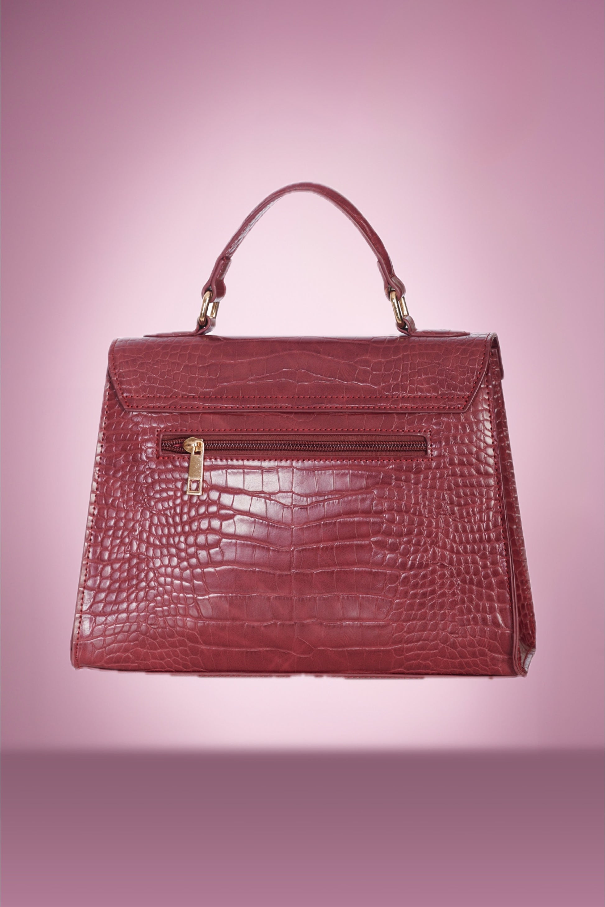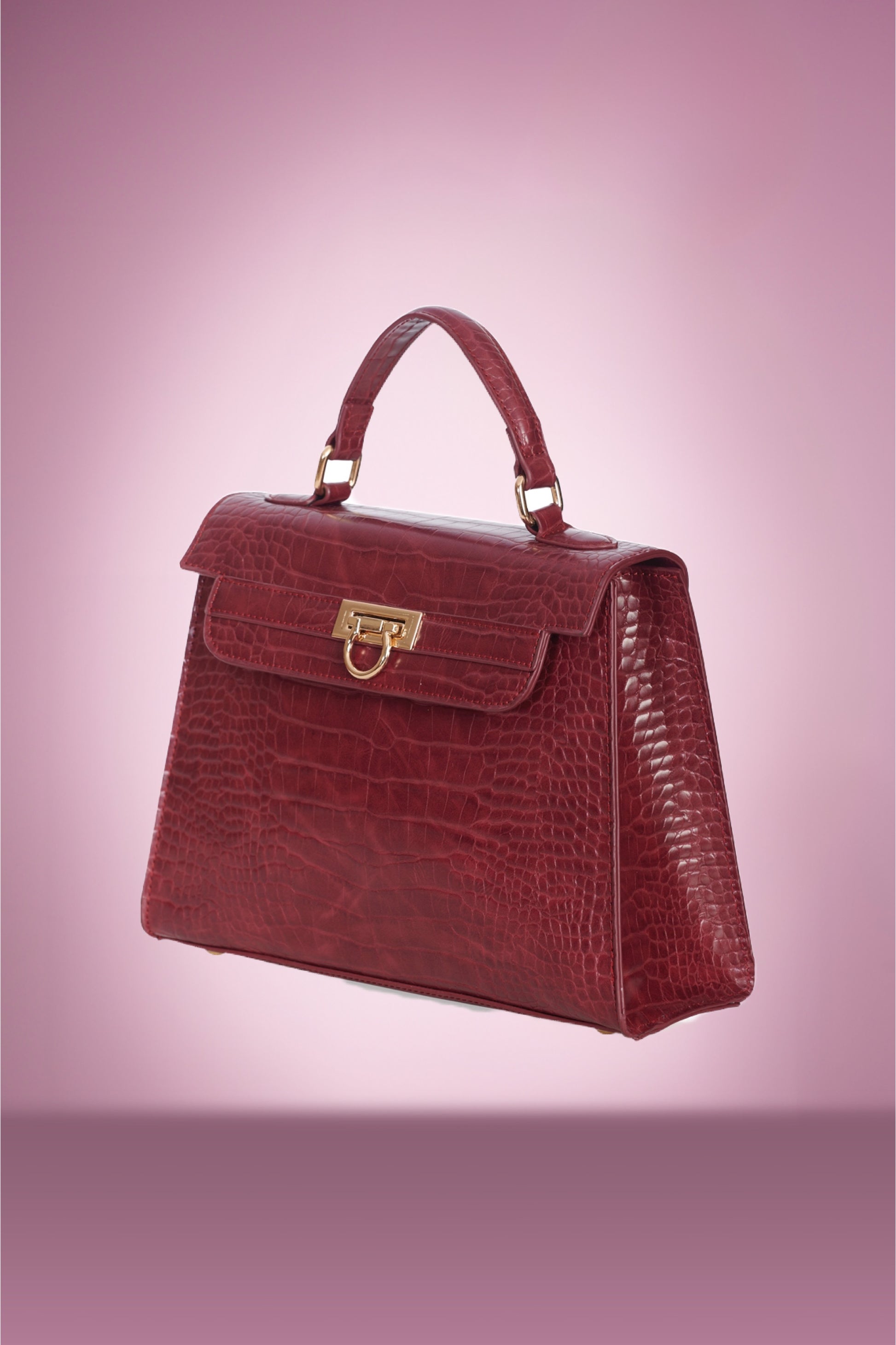 Introducing the Joanie Handbag in luxurious burgundy. Crafted with crocodile embossed faux leather and a golden lock, this retro-inspired bag is the epitome of sophistication. Its fully lined and comes with a detachable shoulder strap which adds practicality, making it a must-have accessory for any elegant and tasteful individual.